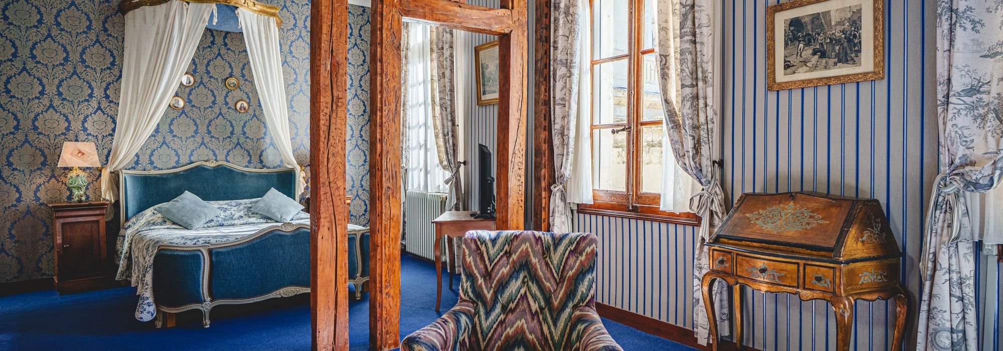 Plongez dans l'élégance et l'histoire au sein de notre Suite Bleue, un véritable cocon de sérénité au cœur de Saumur. Spacieuse et lumineuse, cette suite a été restaurée dans le respect du style d'époque, mêlant avec raffinement mobilier ancien et confort moderne.